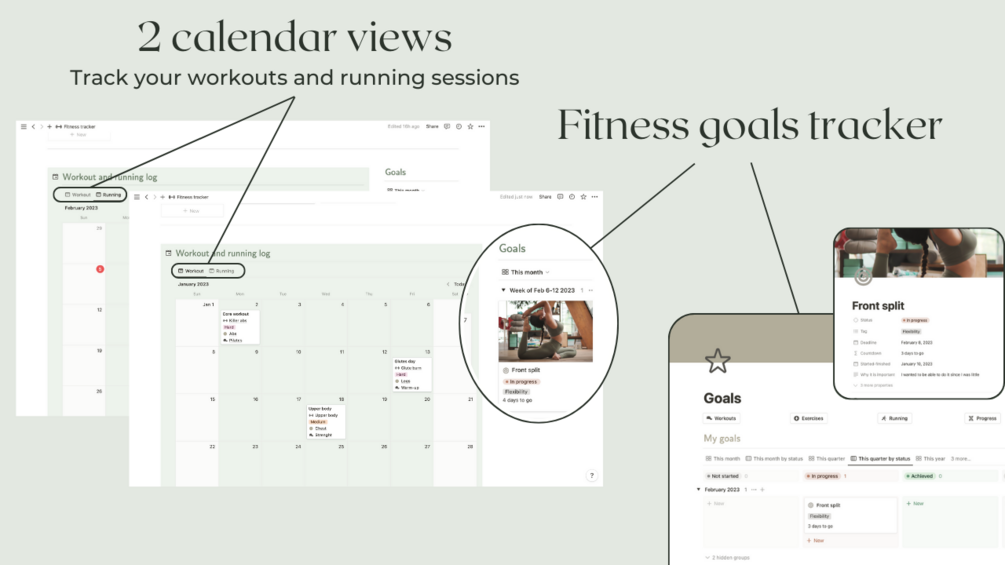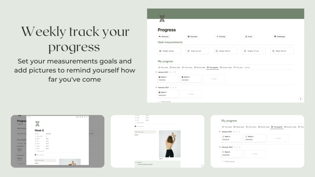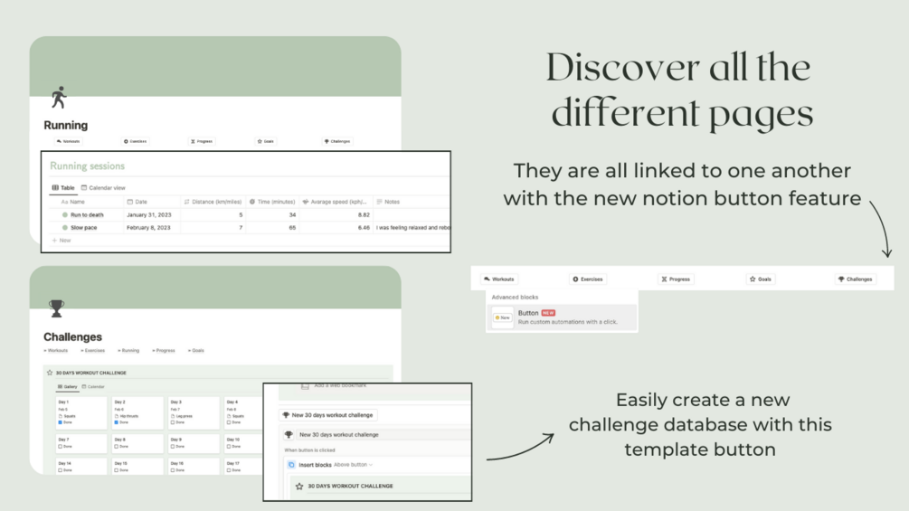 - Green themed fitness tracker made of 7 pages + 4 databases