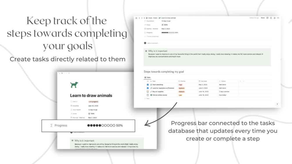 Keep track of all the goals you want to reach with this aesthetic, green themed notion template: divide them into smaller steps to keep the focus on your objectives and to make them easier to achieve.