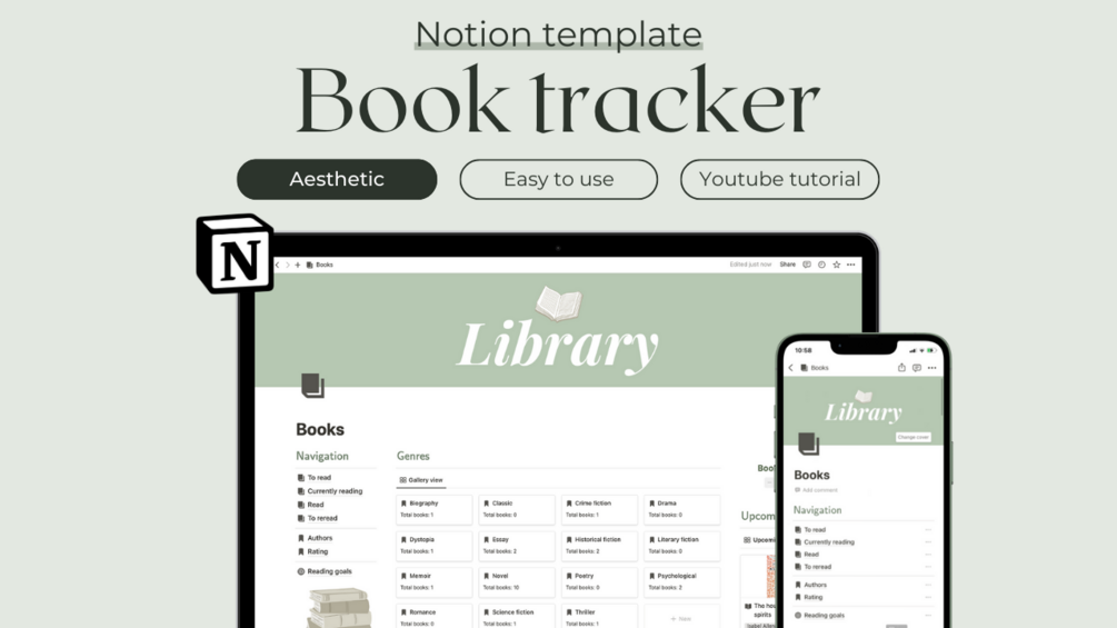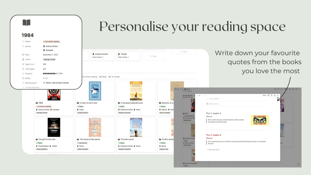 Keep track of all the books you read with this aesthetic, green themed notion tracker. Write down your favourite quotes and divide your books by authors and status.