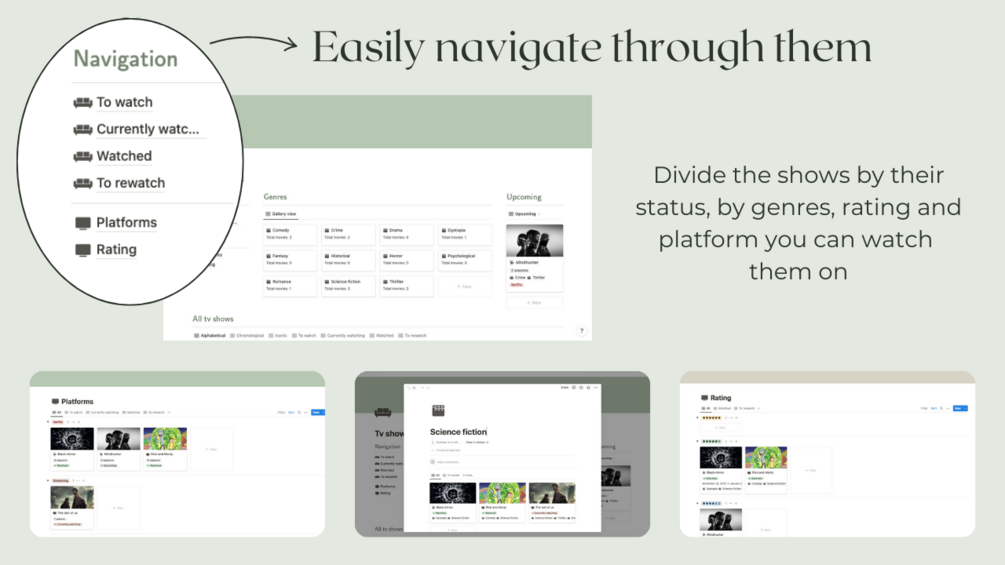 Keep track of all the tv shows you watch with this aesthetic, green themed notion tracker. Write down your favourite quotes and divide your tv shows by rating, genres and status.